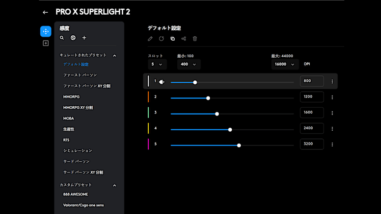 G HUB に搭載された HERO 2 センサーを使用すると、X 軸とY 軸の DPI の微調整、リフトオフ距離のカスタマイズ、さまざまな高さのマウスフィートに合わせたトラッキングの最適化、古いマウスの感度の再現が可能になります。さらに、感度設定ページでは、2kHz、4kHz、8kHz などの、より高いレポートレートにアップグレードすることができます。